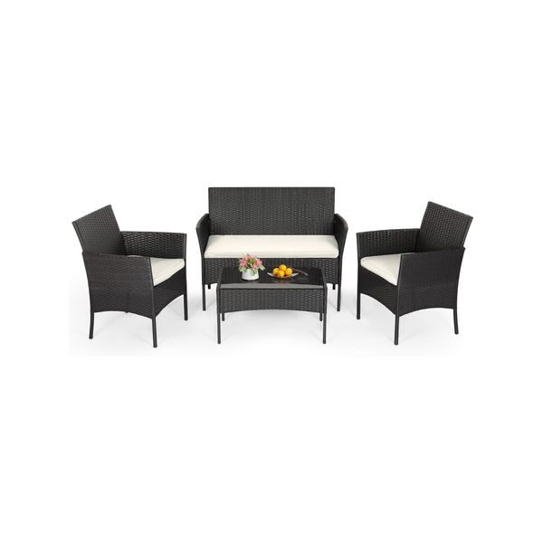 This patio set has thick, high-density rebound sponge cushions for cozy seating. Its simple, stylish look suits patios, balconies, poolside, or gardens.