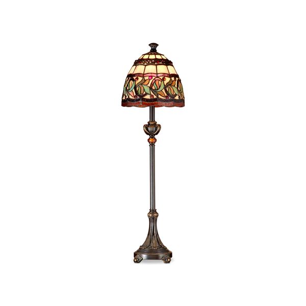 Ideal for pairing in traditional spaces, the Aldridge buffet lamp from Dale Tiffany offers a graceful take on classic style. The hand-rolled art glass shade in tones of ruby, amber and emerald brings a touch of color atop its slender, antique golden bronze-tone base.