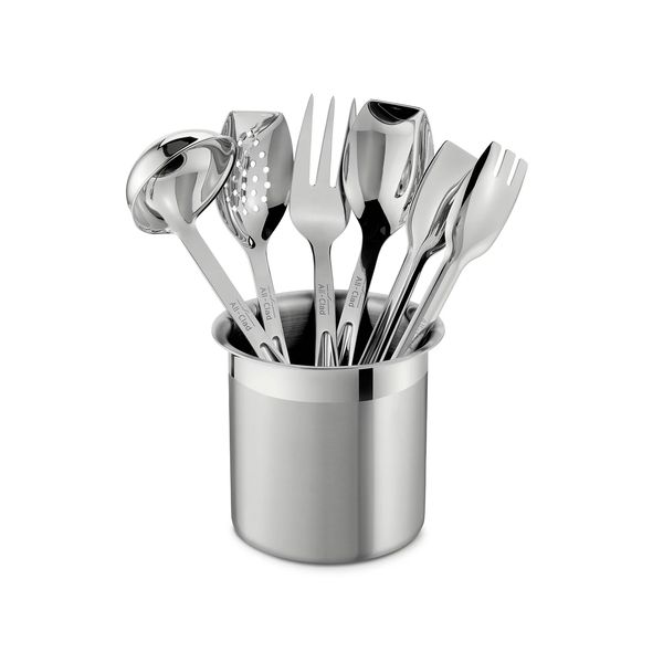 Tools to take over the kitchen. You are the master chef of your space with a comprehensive set of do-it-all stainless steel tools, including tongs, ladle, slotted spoon and more in a durable brushed and branded storage canister that organizes and accents your countertop. These 9″ tools are made shorter in length than traditional All-Clad tools for even more precision while prepping and serving. Lifetime warranty.