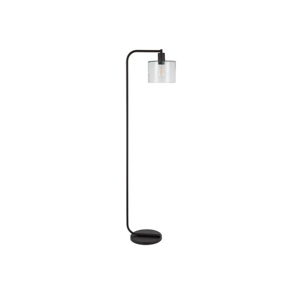 This industrial floor lamp takes notes from factory lighting. It lightens the mood with a seeded glass shade, bringing in natural textures to both the lamp and the room around it.