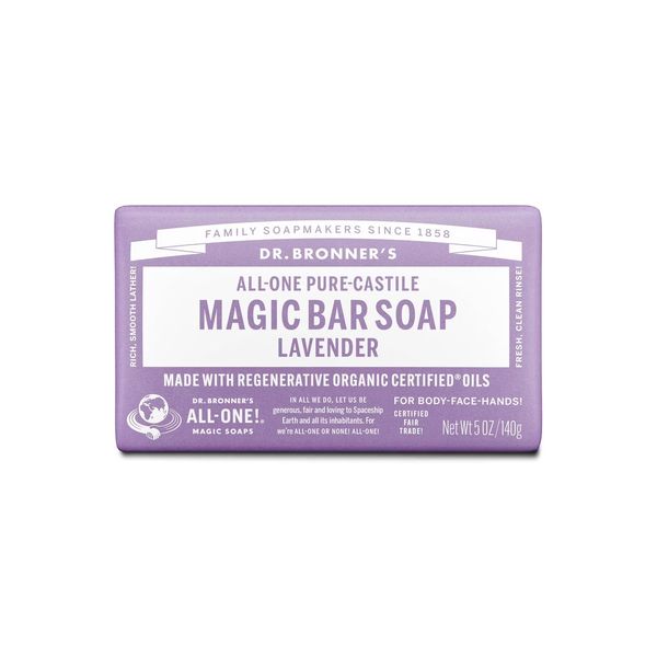 Dr. Bronner’s Lavender Pure-Castile Bar Soap! Scented with pure lavender and lavandin oils to calm the mind and soothe the body! Dr. Bronner’s Lavender Pure-Castile Bar Soap is made with certified fair trade ingredients and organic hemp oil for a soft, smooth lather that won’t dry your skin. Readily biodegradable and packaged in a 100% post-consumer recycled paper wrapper. Dr. Bronner’s Pure-Castile Bar Soaps are 100% cruelty-free, vegan, gentle, and versatile. With no synthetic preservatives, detergents, or foaming agents, they’re even gentle enough for sensitive skin. They will leave your skin feeling soft, smooth, hydrated, and moisturized. All-One!
