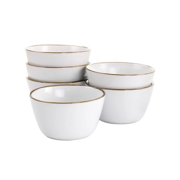 Add a beautiful accent to your dining table with the 6 piece bowl set in sophisticated matte white with gold-tone rim trim. Each piece is creatively crafted with a unique flat base and trimmed in gold-tone.
