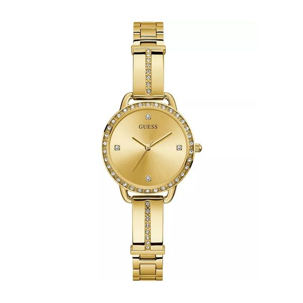 Slim lines of crystals accentuate the shapely case and semi-bangle bracelet of this glamorous gold-tone timepiece from GUESS.