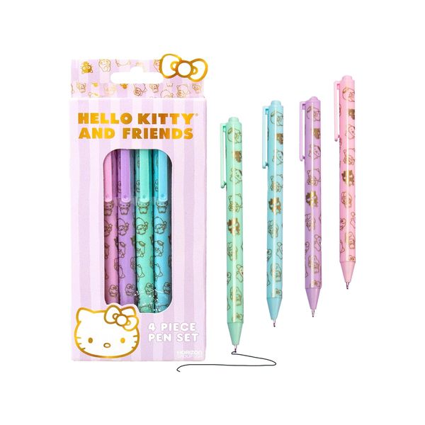 Add a touch of kawaii to your stationery with the Hello Kitty & Friends 4-Piece Pen Set — because everyone needs a Hello Kitty pen! This adorable set includes pink, purple, teal, and blue ballpoint pens, each adorned with a shiny gold foil illustration of your favorite Sanrio characters, including Hello Kitty, My Melody, Pompompurin, Badtz-maru, and more! The pens write in smooth black ink, making them perfect for taking notes, doodling, or simply adding Hello Kitty magic to your everyday writing! Whether you’re looking for super cute school supplies, kawaii stationery, Kuromi school supplies, an all-new stationery set, kawaii office supplies, or something for your Hello Kitty pencil case, these pens are the perfect choice! Ideal for anyone who loves cute Sanrio stuff ages 6 and older.