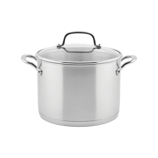 Enjoy every meal you make in this 8-quart capacity covered stockpot by KitchenAid, built with two layers of thick stainless steel surrounding an aluminum core. Sleek induction-compatible design features etched measurement markings for easy addition of ingredients.