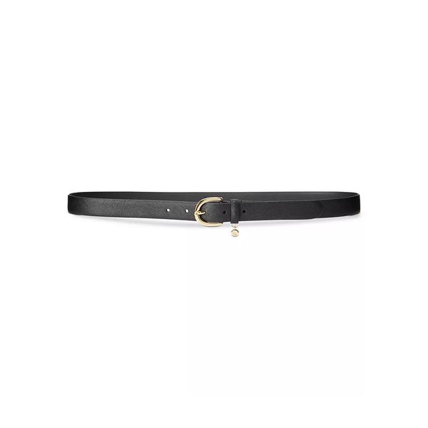 A logo-engraved charm and shiny buckle finish this luxurious crosshatch leather belt by Lauren Ralph Lauren.