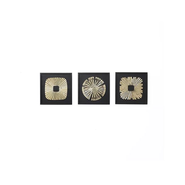Elevate your interior style with this 3-piece modern black and gold abstract metal wall art set. Each panel features a unique sunburst-inspired design in a metallic gold finish, mounted on a sleek black wood background for striking contrast.The classic black gold color scheme creates a simple and luxurious style, with a striking visual effect. The abstract geometric lines and metallic sheen create a stunning focal point in any living room, bedroom, or hallway. Each piece measures 15.75″H x 15.75″W, with two sturdy hooks on the back for easy and secure installation. Perfect for creating a cohesive and artistic wall display.