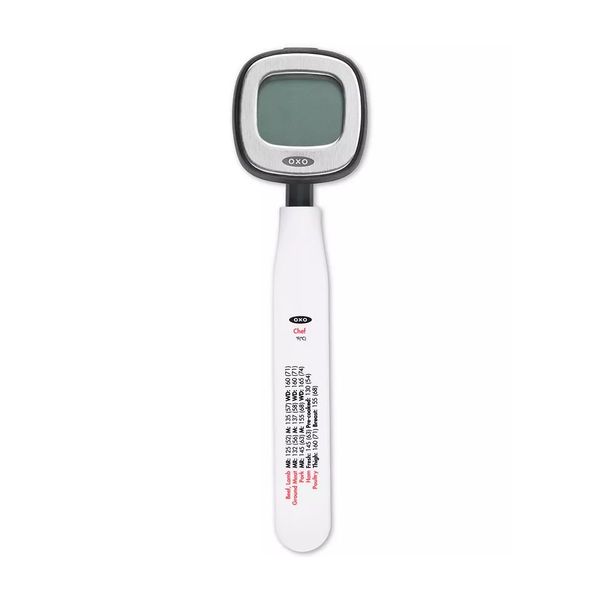 Don’t guess whether food is done—use a digital food thermometer. The OXO Good Grips Chef’s Precision Digital Instant Read Thermometer gives you the accurate internal temperature of your meats, seafood, cakes and breads. Digital thermometers are fast and precise, and our large display means you won’t struggle to determine the temperature. No need to insert the whole probe: The ultra-thin tip works quickly and is delicate with your food. The thermometer’s head pivots 90° so you can read the display at a variety of angles. The storage sleeve keeps chef- and USDA-recommended food temps at your fingertips. Thermometer range is -40°F and 302°F (-40°C and 150°C). Battery included.