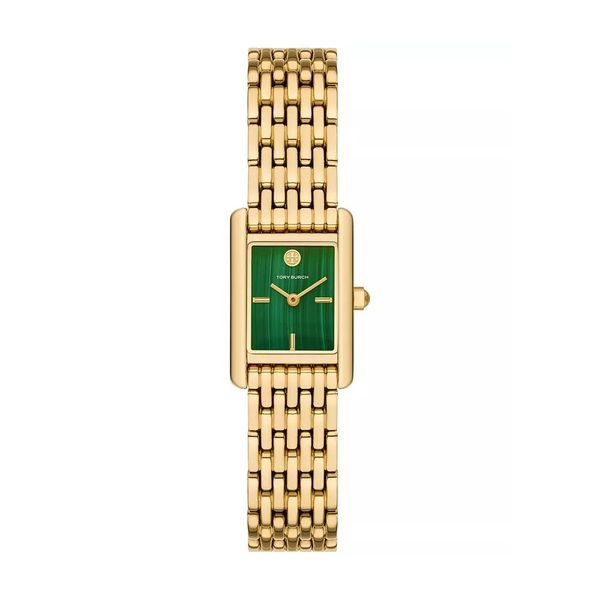 Clean-lined and elegant, The Eleanor watch by Tory Burch features a green malachite dial with three-hand movement.
