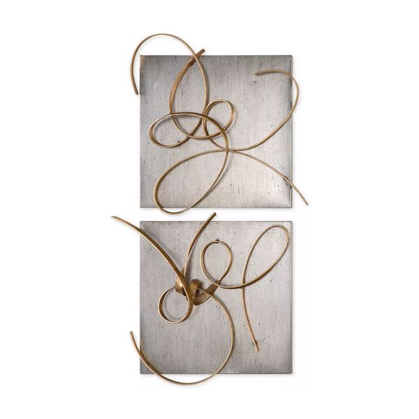 Winding outside the lines, the Uttermost Harmony wall art set’s hand-forged gold-leaf-finished metal flourishes swirl upon and beyond the lightly burnished silver-leaf-trimmed backgrounds.
