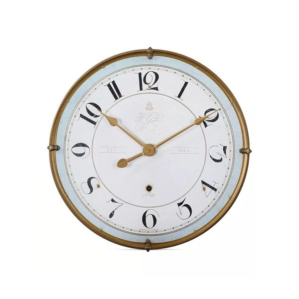 Capture the romance of an Italian train station with the antique-inspired Torriana clock by Uttermost. With gleaming metal hardware that beautifully contrasts with its antiqued ivory face and pale blue border, it lends elegance to any room.
