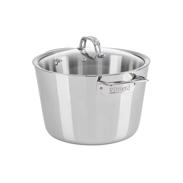 The Viking Contemporary 3-Ply Stainless Steel 8 Quart Stockpot with Lid combines a modern, Windsor pan inspired design with the exceptional performance of 3-Ply stainless steel cookware. The conical sides are angled out to provide more surface area for evaporation while the walls retain more heat.